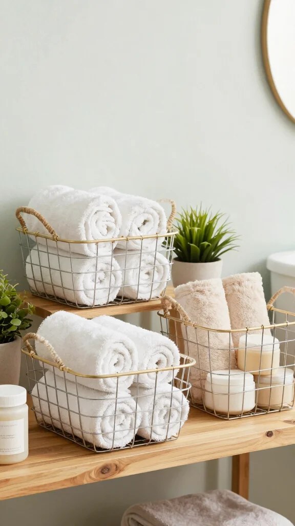 Stylish wire baskets are a chic way to keep your bathroom organized while adding a modern flair. These versatile baskets can be hung on walls or placed on shelves, effortlessly combining form and function. Their open design keeps items visible and accessible, making it easy to grab what you need while maintaining a clean look.