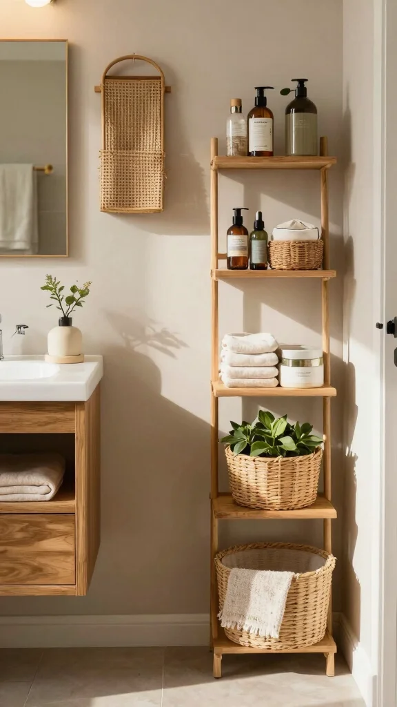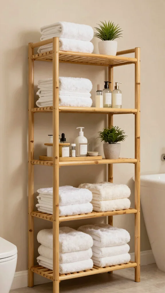Consider using a vertical bamboo unit to create a striking focal point while providing ample storage for towels, toiletries, and decorative items. The natural grain of bamboo brings warmth and a calming atmosphere, reminiscent of a spa retreat.