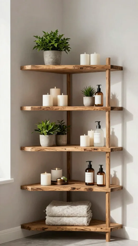 Consider installing multiple tiers of corner shelves to create an inviting display of decorative items and essential toiletries. The angular design not only adds visual interest but also makes for an ideal spot for plants or candles, infusing personality into your space.