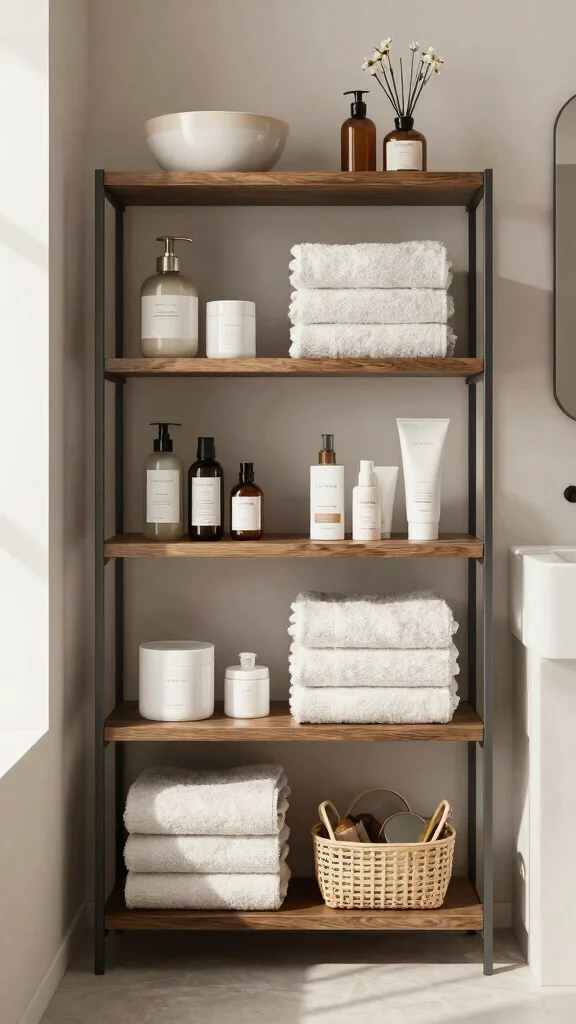 The open design allows for a casual display, enabling you to easily switch items in and out as needed. Choose a wooden or metal finish that complements your bathroom’s color scheme, creating an uplifting look.