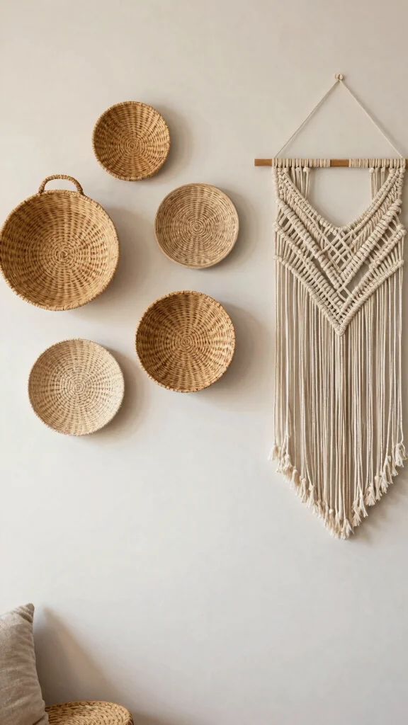 For an effective display, consider these wall decor ideas: hang a series of woven baskets to create depth, choose macramé pieces that reflect natural hues, and use removable wall decals for a stylish yet temporary solution.