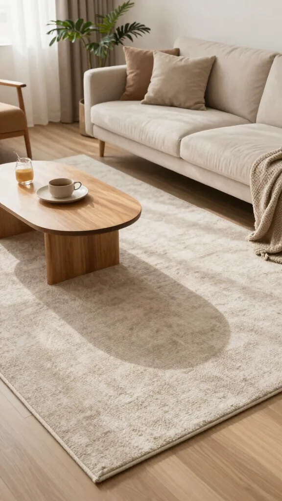When selecting a rug, keep these tips in mind: choose light, neutral colors that seamlessly blend with your decor, consider round or irregular shapes to soften sharp angles, and look for subtle patterns that add interest without distracting from the minimalist theme.