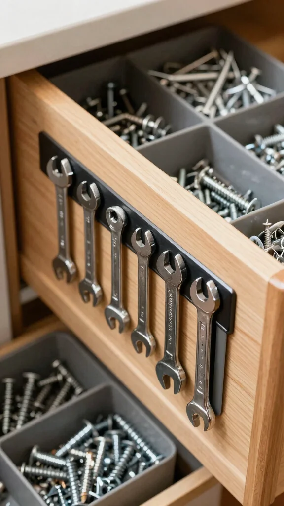 Magnetic strips are an innovative solution for organizing metal tools in your drawers. By mounting these strips inside, you can efficiently store tools securely while keeping everything visible and easily accessible. This clever method helps prevent clutter and keeps your workspace tidy.