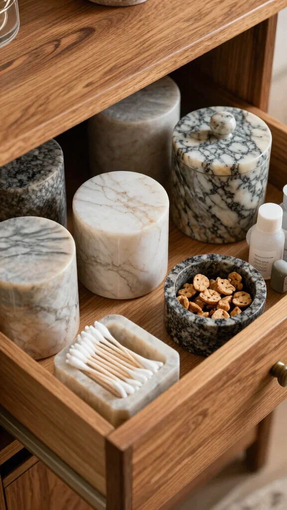 Natural stone storage jars, like those made from marble or granite, add an elegant touch to your drawer organization. These jars are versatile, holding everything from cotton swabs in the bathroom to snacks in the kitchen, while their unique textures enhance any decor style.