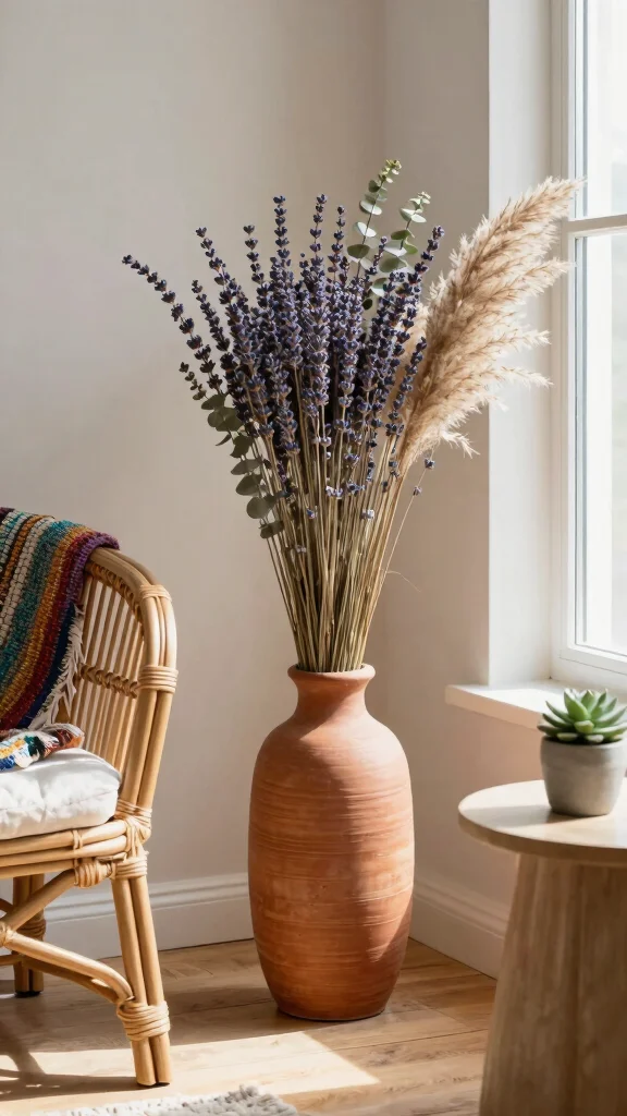 Dried florals are a wonderful way to bring a touch of nature indoors. Their low maintenance and longevity make them an ideal choice for busy homes. Imagine a tall floor vase filled with charming dried lavender, eucalyptus, and fluffy pampas grass, creating a stunning focal point in any empty corner. This arrangement captures the beauty of flowers without the worry of wilting, inviting a sense of tranquility into your space. The soft textures of dried florals enhance the relaxed ambiance, while the height of the vase draws the eye upward, creating an inviting atmosphere in your home.