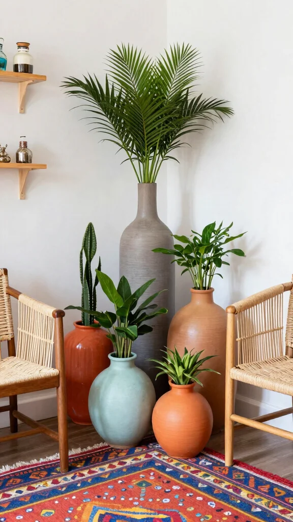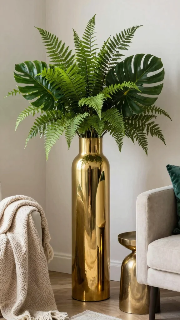 Introducing metallic floor vases can add a touch of glamour to your decor, elevating the mood of any corner. These shiny pieces, in gold, brass, or copper, catch the light beautifully and create a modern twist on bohemian aesthetics. Pairing metallic vases with lush greenery creates a striking visual effect that enhances your space.