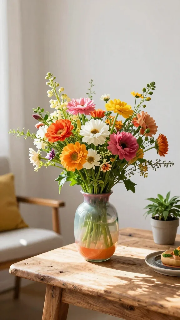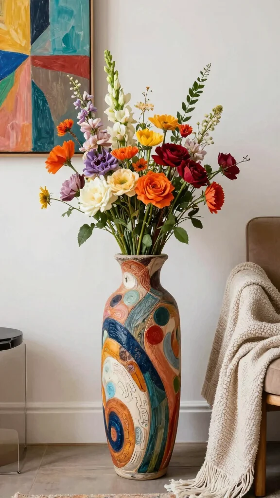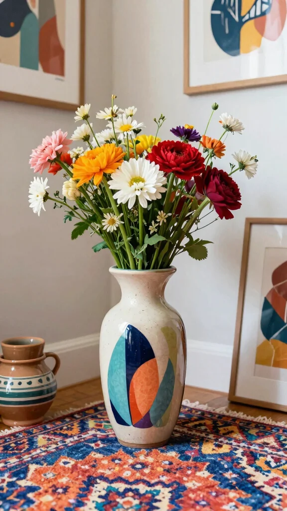 To make the most of this idea, consider selecting vases that incorporate colors found in other decor elements for a cohesive look. Pair your colorful vase with equally vibrant accessories like throw pillows or wall art to enhance the bohemian aesthetic. Mixing styles can create a playful, eclectic atmosphere that invites curiosity.