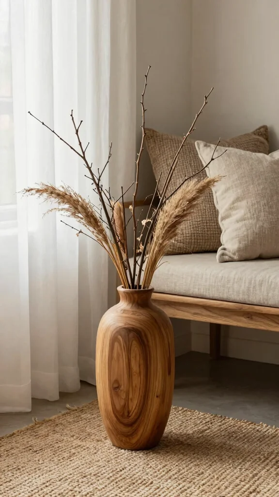 Fun fact: Wooden vases bring in natural warmth—think handcrafted grain and earthy textures—boosting cozy vibes by up to 35% in bohemian spaces. Try large wooden vases filled with dried plants for true floor vase decorating ideas that feel timeless and alive.