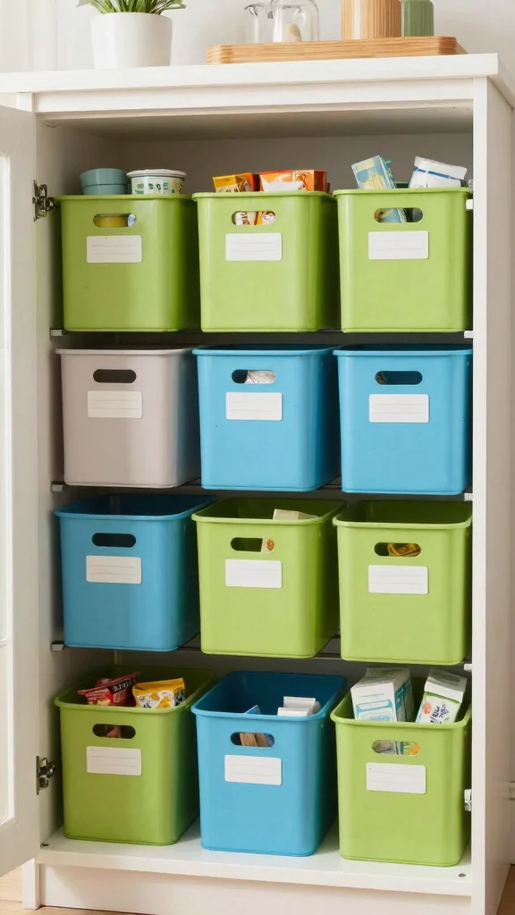 – Choose colorful bins to brighten up your cabinets.