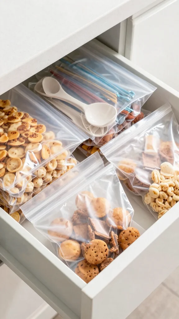 Don’t overlook clear storage bags as an effective organizational tool for your kitchen. These versatile bags are perfect for storing snacks, utensils, or other small items that can clutter your drawers. Their transparent material allows you to quickly see what’s inside, making it easier to grab what you need while cooking.These bags take up minimal space and can be neatly stacked or tucked away in corners of your drawers. This simple solution can dramatically enhance the functionality of your kitchen.- Choose bags with strong zippers to keep contents secure.- Label each bag for quick identification and ease of access.- Regularly check for expired items to keep your kitchen fresh.Using clear storage bags is a straightforward way to declutter and improve your kitchen’s organization!
