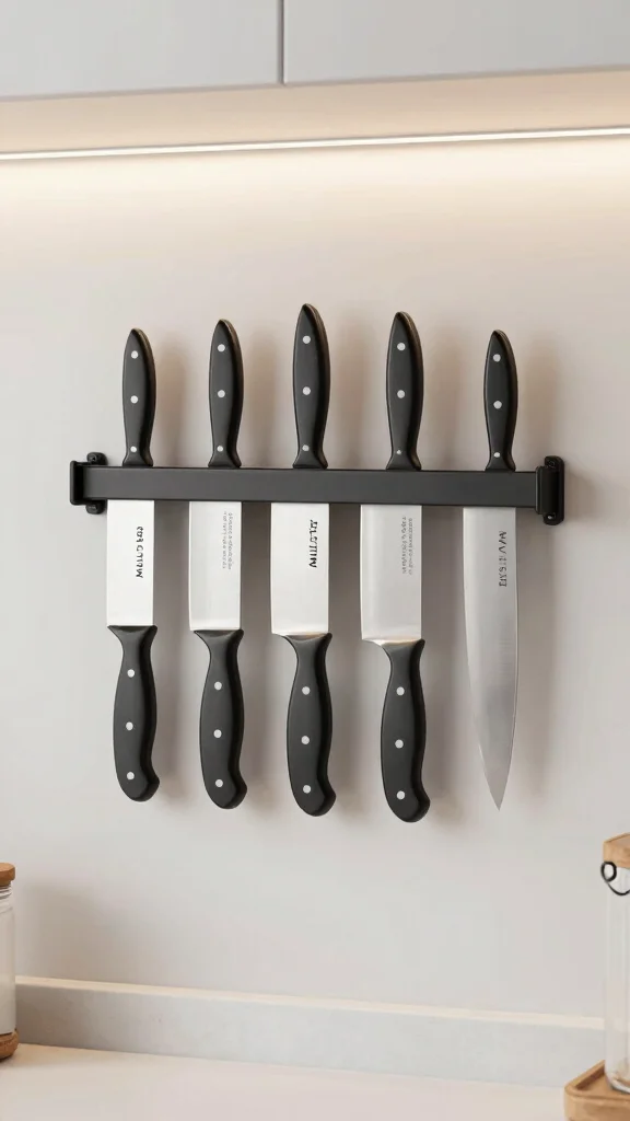If you prefer to keep knives visible, wall-mounted magnetic knife strips are an excellent choice. These strips free up valuable drawer space while ensuring your knives are always accessible. Their sleek design enhances your kitchen’s decor, allowing for an organized and stylish cooking environment.Ensure the magnetic strip is securely installed to support your knives effectively. Organizing by size or purpose maximizes efficiency during food prep, making cooking a breeze.- Regularly clean the strip to maintain its magnetic strength.- Keep knives organized for easy access when cooking.- Choose a strip design that complements your kitchen style.A magnetic knife strip simplifies cooking while adding a modern touch to your kitchen decor!