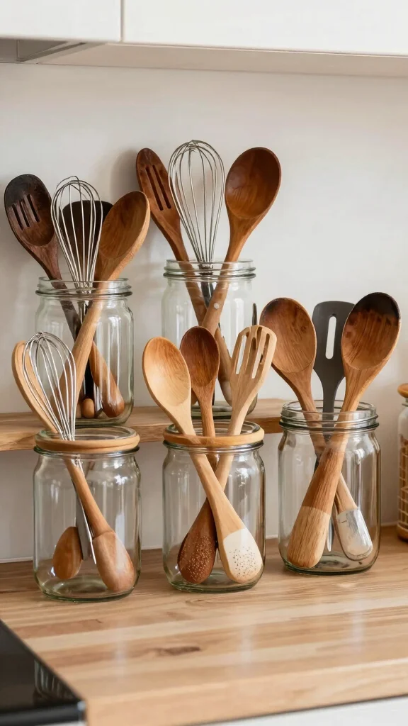 Using repurposed jars is a charming and eco-friendly way to store kitchen utensils. These clear jars can hold everything from wooden spoons to whisks, adding a rustic yet stylish element to your kitchen. Labeling jars keeps similar utensils together, allowing for easy access and a personal touch in your decor.Consider using a variety of jar sizes for added visual interest in your kitchen organization. Decorating jars with twine or paint can further enhance their appeal, creating a cohesive look.- Group similar utensils in color-coordinated jars for a unified appearance.- Use different jar sizes to create an eye-catching display.- Ensure jars are clean and free of any residue.Repurposing jars not only organizes your utensils but also beautifies your kitchen space!