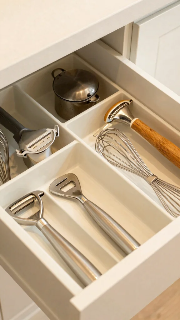 If your kitchen is filled with various gadgets, investing in drawer inserts is essential for maintaining order. These organizers help you categorize everything from peelers to bottle openers, ensuring your drawers remain tidy and functional. With everything in its place, cooking becomes a more enjoyable experience.Select inserts that fit your drawer dimensions perfectly to maximize space utilization. This way, you can quickly locate your tools, allowing for more efficient meal prep.- Group gadgets by purpose for easy access; keep cutting tools together.- Use adjustable inserts for added flexibility in organization.- Regularly evaluate your gadgets and remove those that aren’t frequently used.With drawer inserts, you can streamline your cooking process and eliminate the frustration of searching through a jumbled mess!