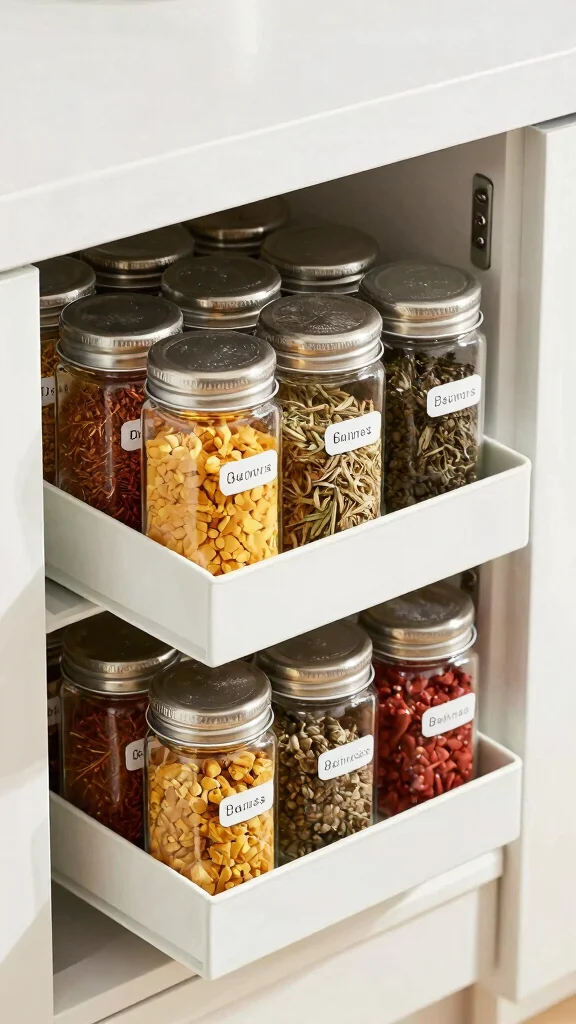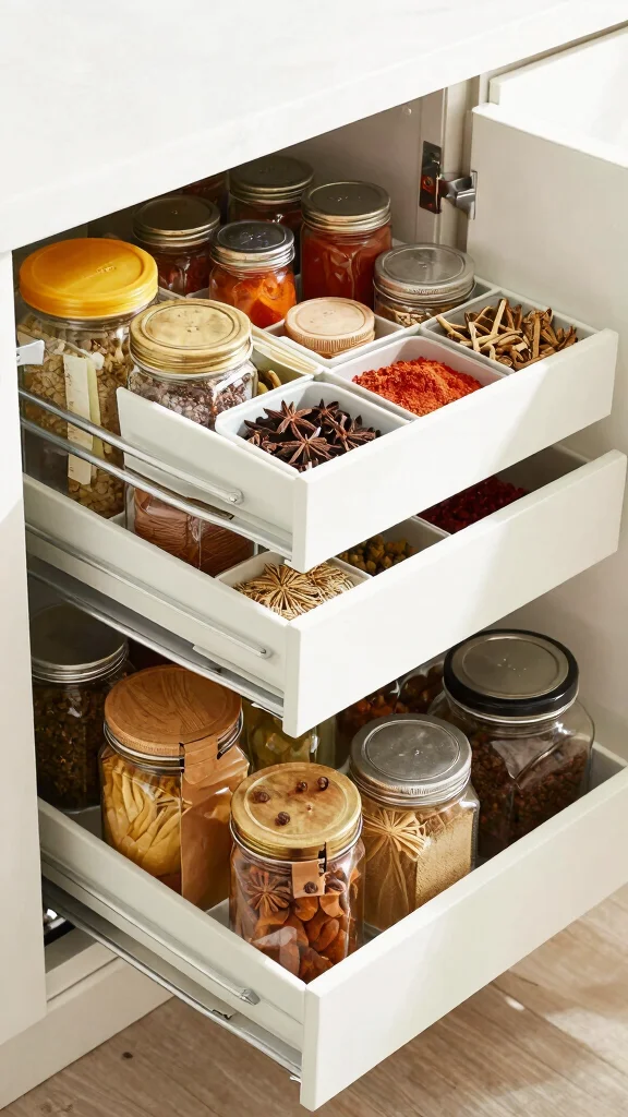 Optimize your spice storage with adjustable spice racks that fit snugly in your drawers. These racks keep your spices organized and easily reachable, ensuring you have what you need at your fingertips while cooking. Their adjustable design allows you to maximize vertical space, making it easier to see what you have on hand.Sort spices by type or frequency of use to streamline your cooking process. Clear jars enhance visual appeal and help you keep track of expiration dates, ensuring freshness.- Label spices for quick identification when cooking.- Regularly check expiration dates to maintain a fresh collection.- Use uniform jars for a cohesive and organized look.With adjustable spice racks, your cooking experience becomes smoother and more enjoyable!