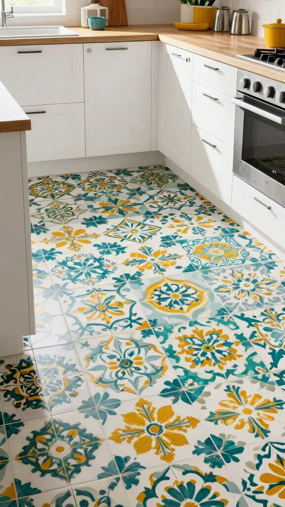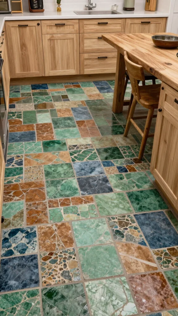How can I create unique floor tile patterns in an eco-friendly kitchen?