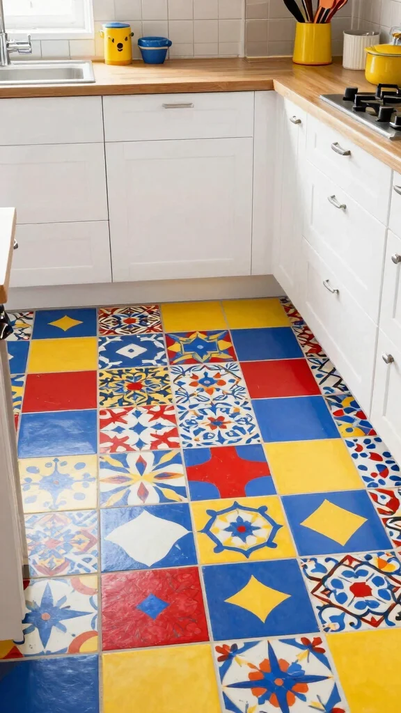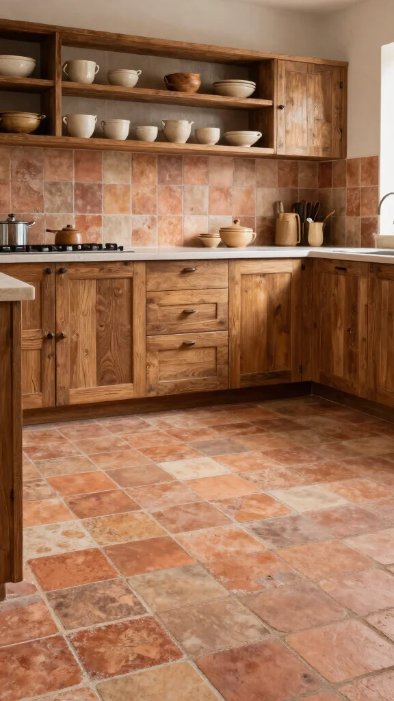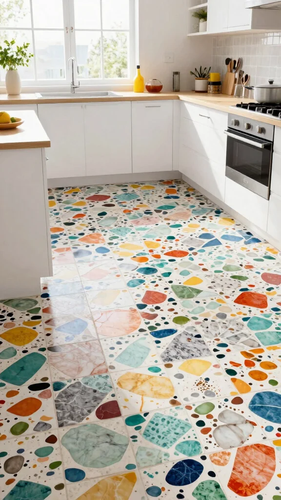 Colorful terrazzo tiles bring personality to any kitchen floor tile design, and they’re surprisingly practical. Pick a bold mix of chips, then seal well—your space stays easy to clean, eco-friendly, and memorable.