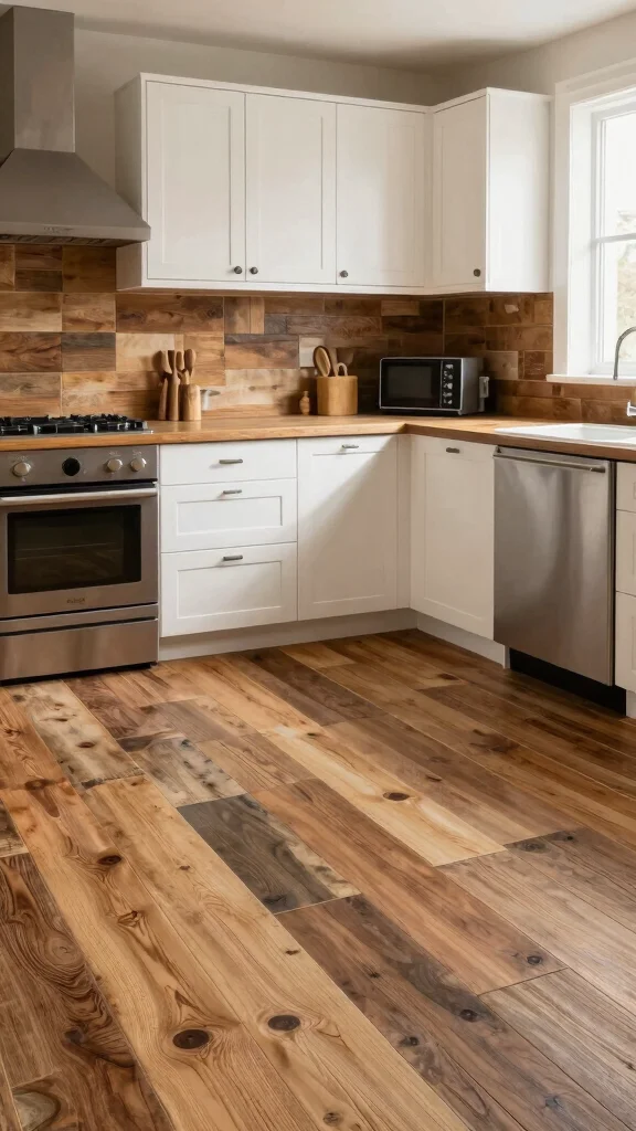 Reclaimed wood tiles provide a perfect mix of rustic charm and eco-friendliness. Crafted from salvaged wood, these tiles carry a history and character that enrich your kitchen’s design. They introduce warmth and depth, creating an inviting atmosphere that feels both homey and stylish.