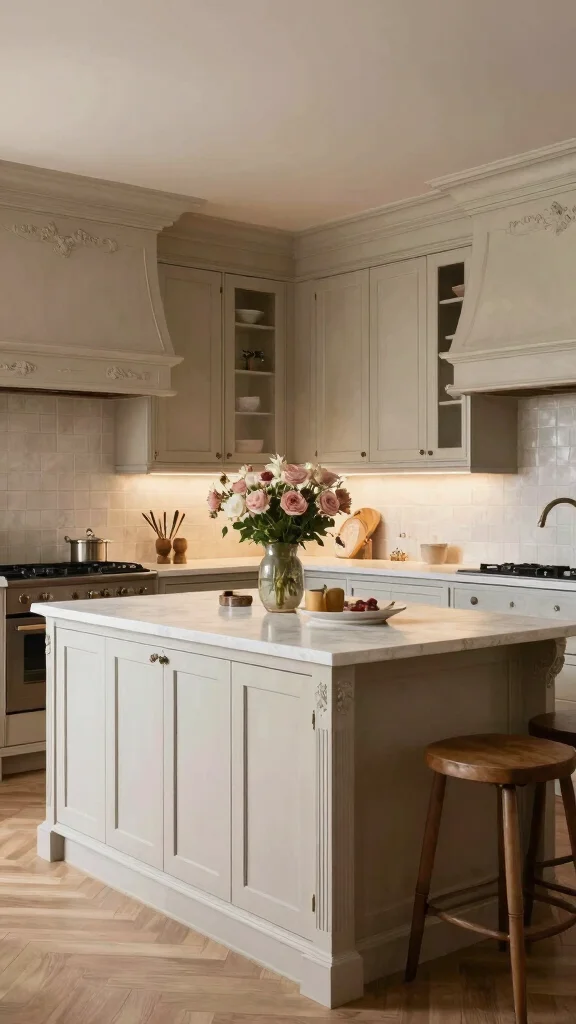 To enhance this elegant aesthetic, use soft, muted colors that create a warm ambiance. Incorporating ornate cabinetry and hardware adds a classic touch that elevates the overall look. A stylish centerpiece on the island can further enhance its visual appeal, making it a true focal point in your kitchen.