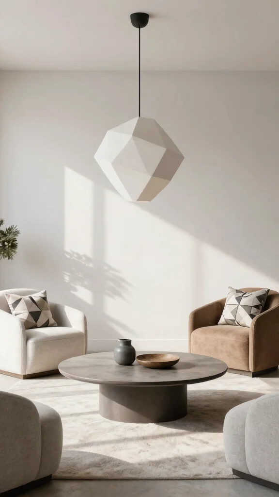 Fun fact: In minimalist interior design living room spaces, geometric accents can make the space feel up to 25% larger. Mix round tables with square sofas and angular lighting to keep things cohesive yet dynamic.