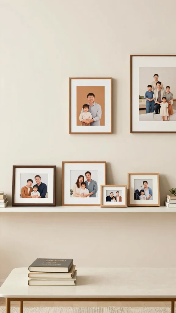 Consider creating a gallery wall with a mix of art sizes, all in similar tones for a cohesive look. Keeping frames uniform in color and style helps achieve a streamlined aesthetic, while wall-mounted shelves can showcase smaller art pieces or decorative objects effectively.