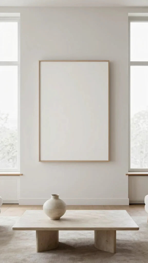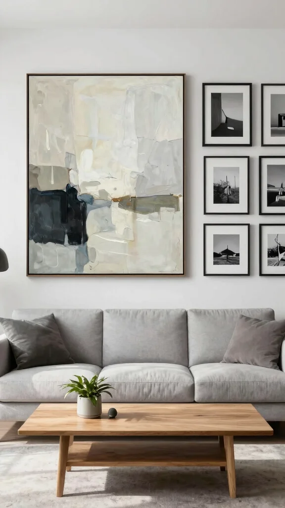 Thoughtfully curated art not only beautifies your living area but also tells a story, enriching the overall design while maintaining a minimalist approach.