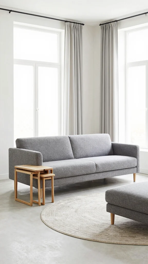 Try these ideas: choose a compact sofa with slim lines, add nesting tables or a coffee table with hidden storage, and use wall-mounted shelves to free floor space. Define the seating area with a single rug, use mirrors to create the illusion of more space, and keep surfaces clutter-free to maintain a calm, minimalist vibe. All of this aligns with minimalist living room ideas and simple interior design principles in a modern home decor style.