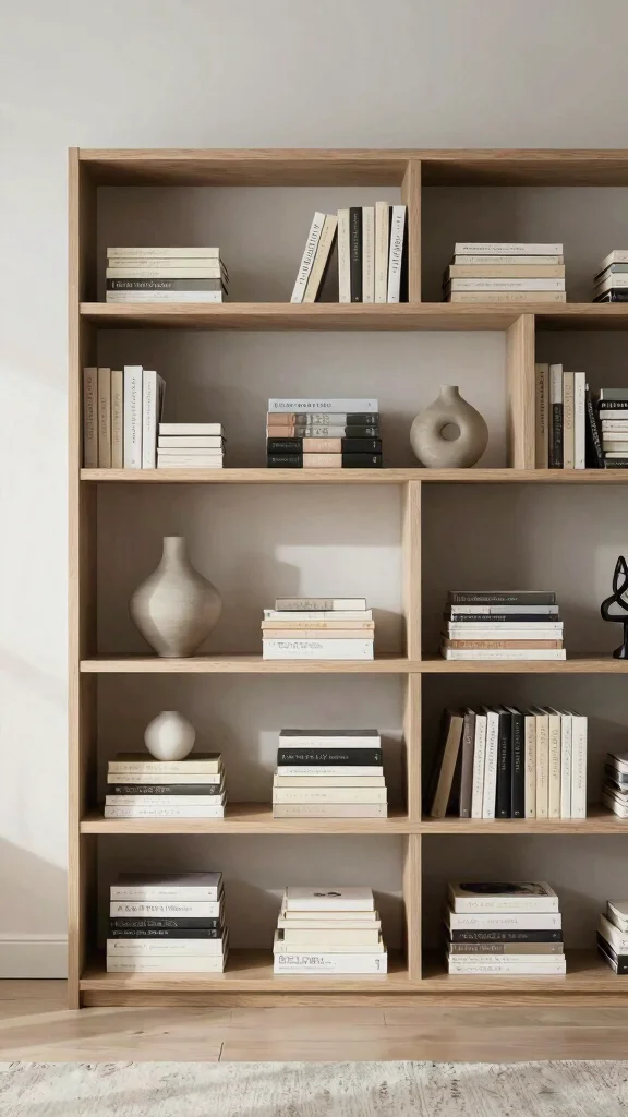Bookshelves can serve both function and style in a minimalist living room. Curate your bookshelf to display a selection of favorite reads and decorative items while maintaining organization. Mix vertical and horizontal book stacking, using bookends to create visual interest without overcrowding.