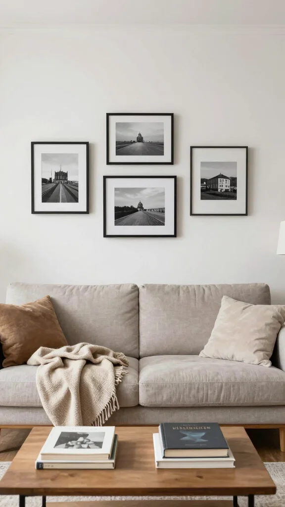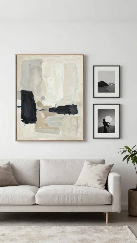 Wall art serves as a wonderful opportunity to inject personality into your minimalist living room without overwhelming the space. Focus on large-scale pieces or a simple gallery wall that adheres to minimalist principles, emphasizing clean lines and limited color palettes. Abstract prints or monochrome photography can elevate your decor, allowing for adaptability as your style evolves.