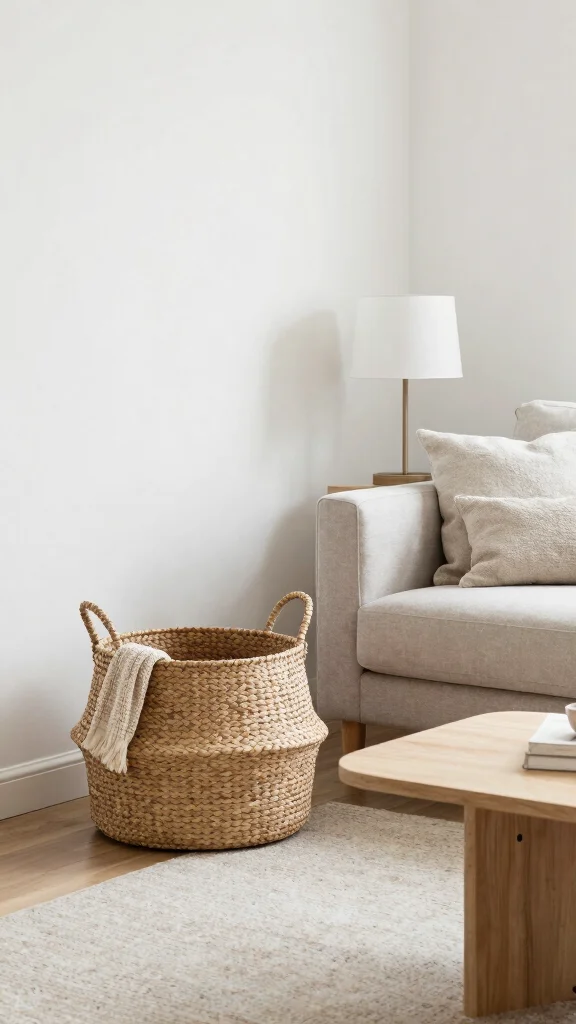 Choose decor items that serve a purpose in your minimalist living room while enhancing its aesthetic. Invest in decorative storage solutions like stylish baskets or chic boxes that hold items while contributing to the room’s look. Items that combine beauty and function, like modern clocks or elegant lighting fixtures, help maintain a clean, streamlined appearance.