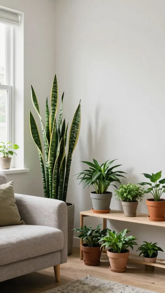 For easy care, look for low-maintenance options like snake plants or pothos, which thrive in various conditions. Grouping plants of different heights adds visual interest while keeping the area uncluttered.