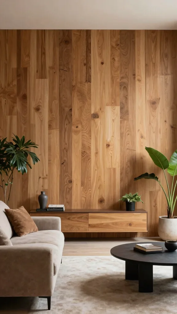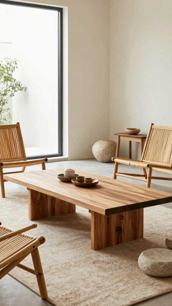 Embracing natural materials enriches your living room, creating a soothing and inviting atmosphere.
