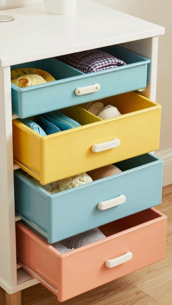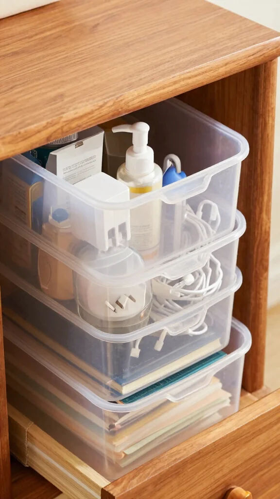 Stackable storage bins are perfect for optimizing vertical space in your nightstand drawers.