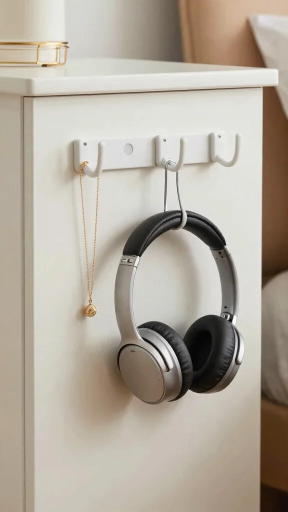 Incorporating hooks on the side of your nightstand is a clever way to keep accessories organized.
