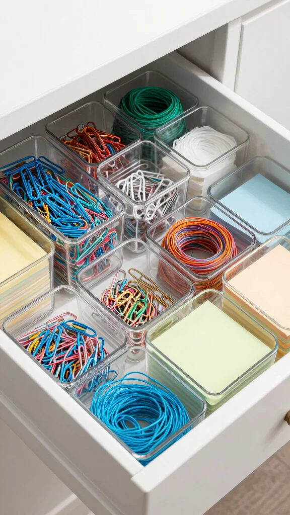 Clear containers are a fantastic solution for organizing small office supplies while keeping them visible. Instead of sifting through piles, transparent containers let you see exactly what you have at a glance, making it easier to find what you need.