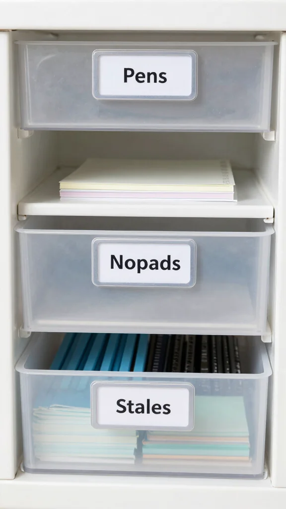 Create distinct sections for writing instruments, paper products, and tools like scissors and staplers. Consider using small baskets or trays to maintain these categories and regularly assess your supplies to adapt as your work evolves.