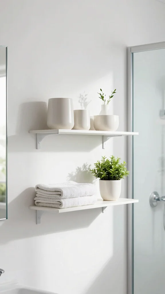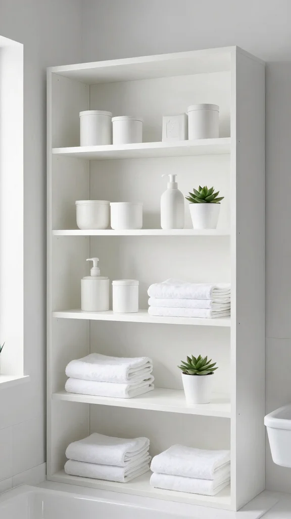 White open shelves create a tranquil vibe, enhancing both style and functionality in any small bathroom.