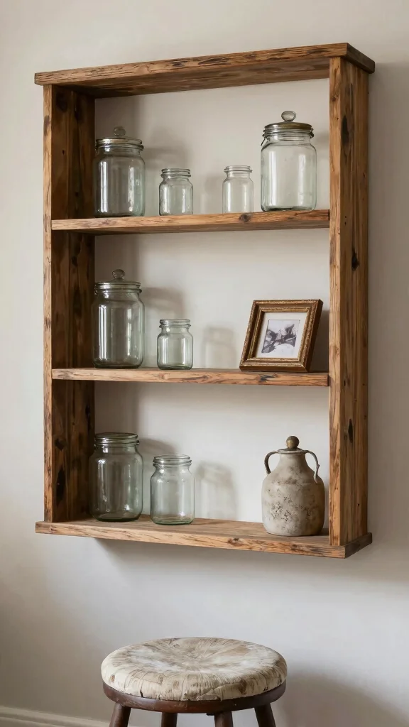 To enhance your vintage displays, mix old and new items for an eclectic appeal. Use the shelves to showcase personal collections, such as vintage glass jars or framed photographs that tell a story. Pairing with wicker baskets can enrich the overall vintage vibe and offer practical storage.