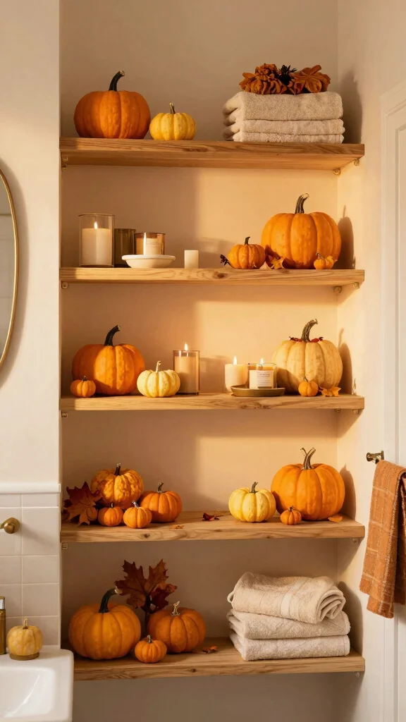 Open shelves are perfect for showcasing seasonal decor, offering a refreshing touch to your bathroom throughout the year. Changing decor items with the seasons keeps your space feeling fresh and exciting, allowing you to celebrate different times of the year with minimal effort.