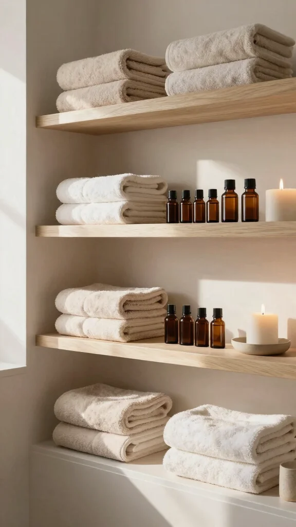 Creating a spa-like atmosphere with your open shelves invites relaxation and rejuvenation, making your bathroom a haven for self-care.