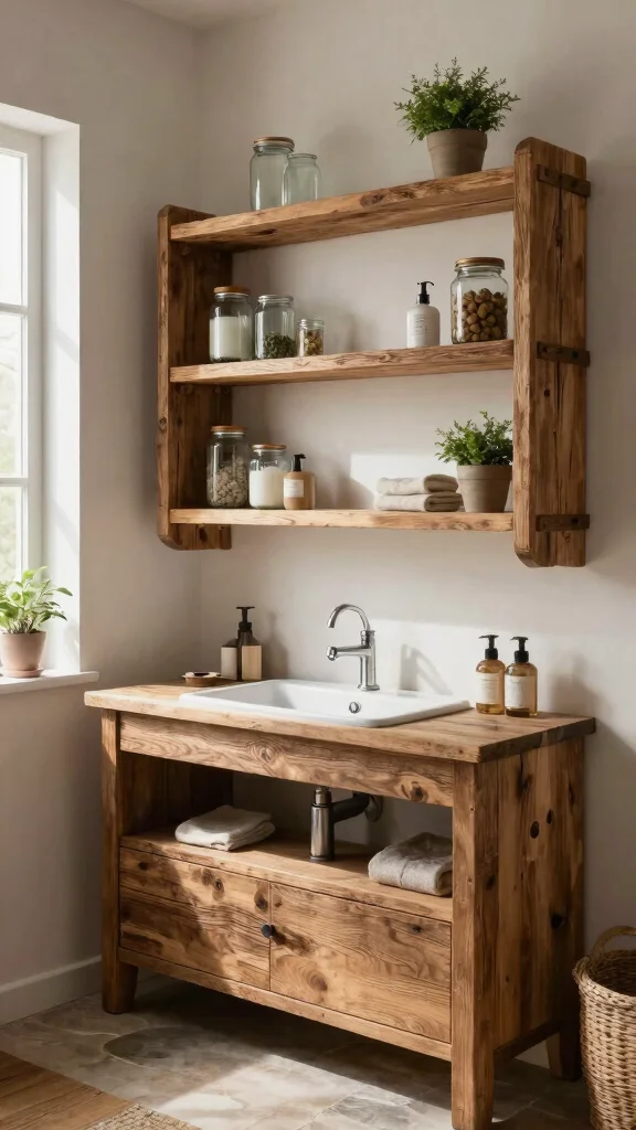 Rustic wooden open shelves bring a cozy touch to your bathroom, infusing it with warmth and natural beauty. Crafted from reclaimed wood, these shelves add character and a sense of history, creating a delightful contrast when paired with sleek modern fixtures. Displaying vintage apothecary jars or lush greenery on these shelves can enhance the inviting atmosphere of your space.