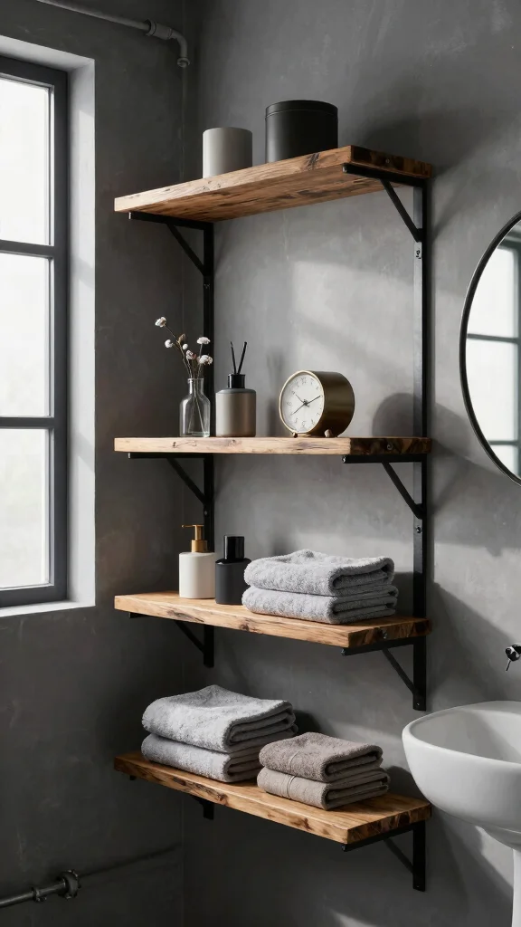 If you’re drawn to a bold and edgy aesthetic, industrial-style open shelves are an ideal choice for your bathroom. Featuring robust metal brackets paired with wooden planks, these shelves create a trendy vibe that’s both functional and visually striking. They can serve as a statement piece while providing ample storage for towels, toiletries, and decorative accents.