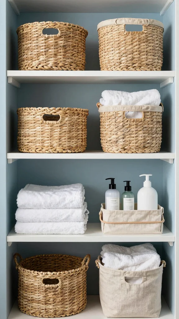 – Incorporate woven, canvas, and metal baskets for depth.