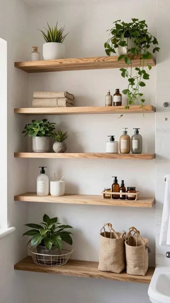 Incorporating small plants on your open shelves can infuse life into your bathroom decor. Plants not only enhance the aesthetic but also improve air quality, making your space feel cleaner and more inviting. Opt for humidity-loving plants like succulents and ferns to create a lush, green oasis in your bathroom.