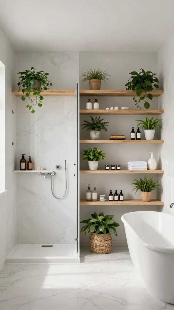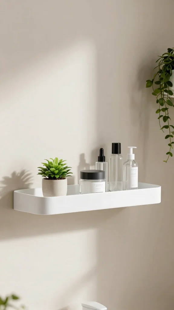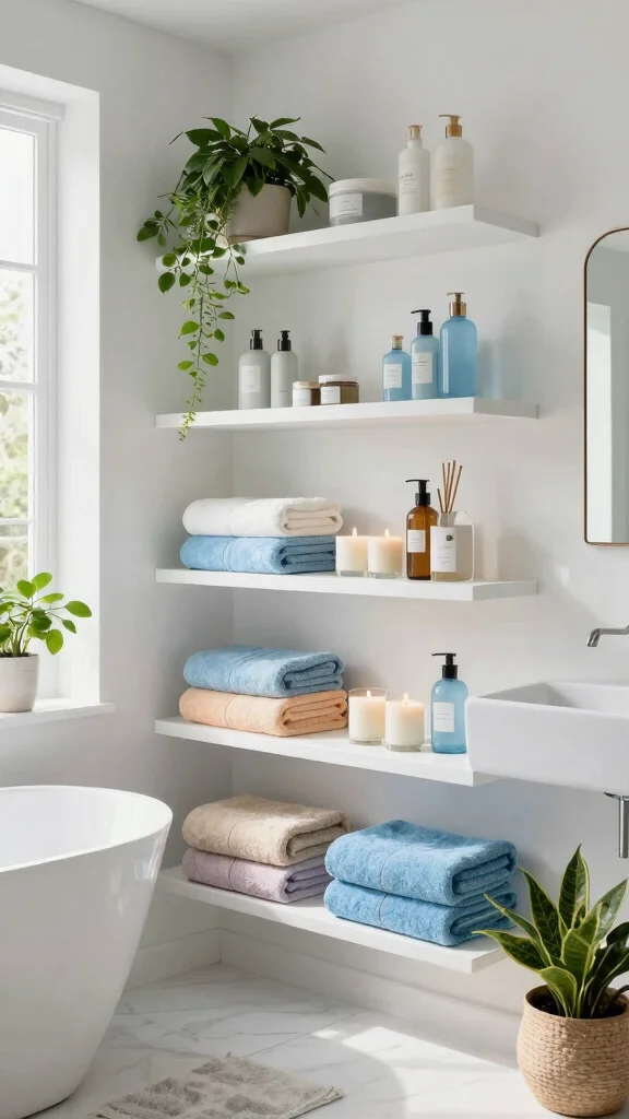 Embracing a minimalist approach, floating shelves can add a touch of elegance to your bathroom without cluttering the space. Their sleek design creates a clean backdrop, allowing essential items like soaps and small plants to shine without overwhelming your decor. A crisp, white floating shelf can make your bathroom feel airy and spacious, transforming it into a serene retreat.