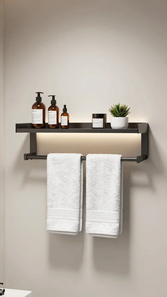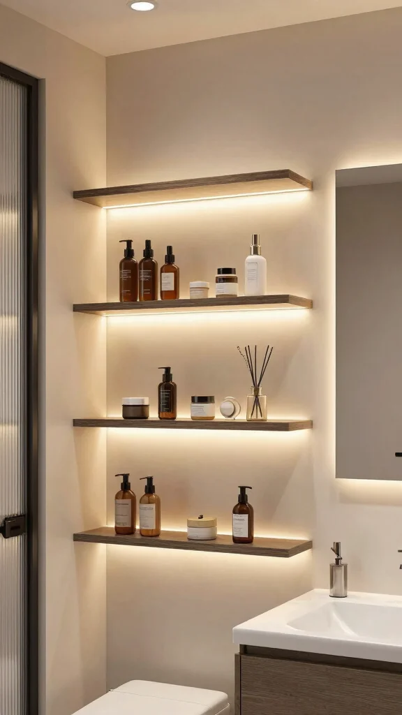 Enhance your bathroom’s ambiance with floating shelves that feature integrated lighting. This modern twist not only offers storage but also creates a cozy glow, perfect for unwinding after a long day. The lighting highlights your decor, making your bathroom feel more inviting.