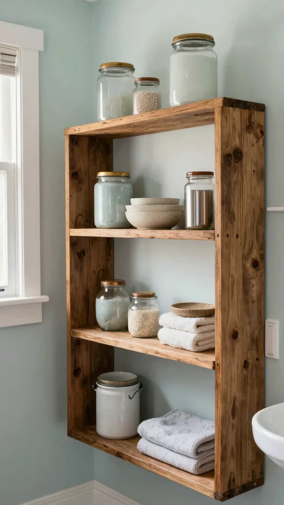 For a cozy and inviting atmosphere, rustic wood shelves can bring warmth to your bathroom. The natural beauty of reclaimed wood introduces charm and character, making it ideal for a farmhouse-style aesthetic. These shelves offer a perfect display for fluffy towels and artisanal soaps, enhancing the homely vibe of your space.