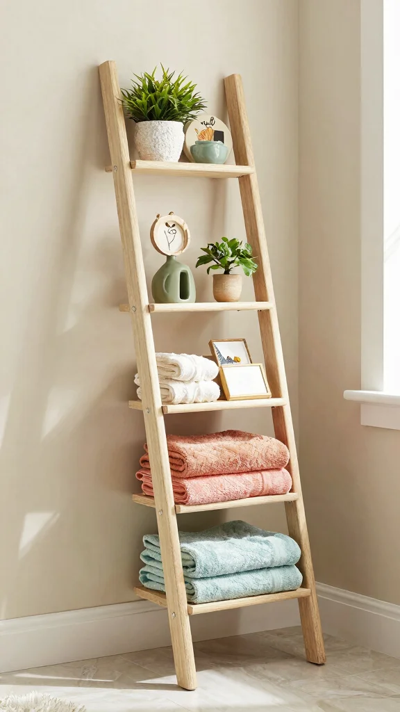 Decorative ladder shelves not only enhance your bathroom’s aesthetic but also provide a unique way to express your style, making your space feel inviting.