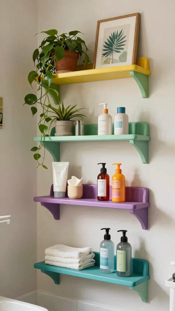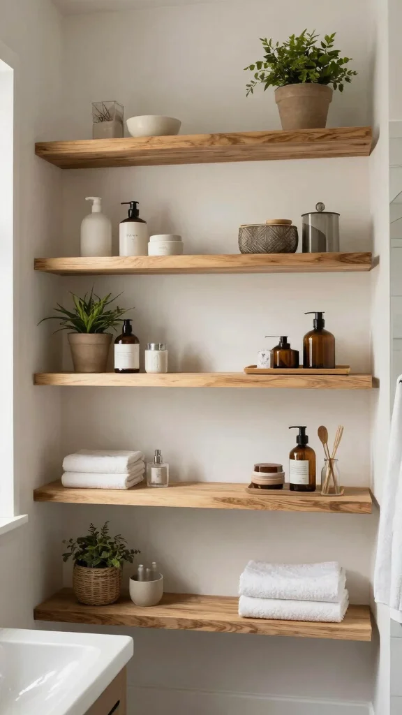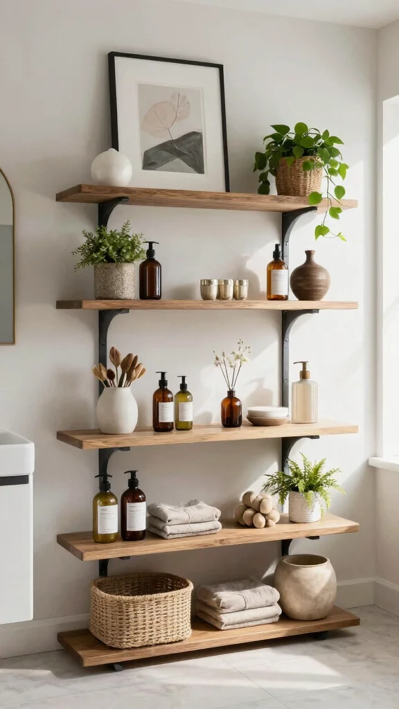 Consider how you plan to use your shelves. Are they for storing toiletries, displaying decorative items, or both? If storage is your primary concern, opt for shelves that can hold baskets or bins, keeping everything organized. Functional bathroom decor can also include shelves with added features, like integrated towel racks or hooks. This dual-purpose approach maximizes space and functionality.