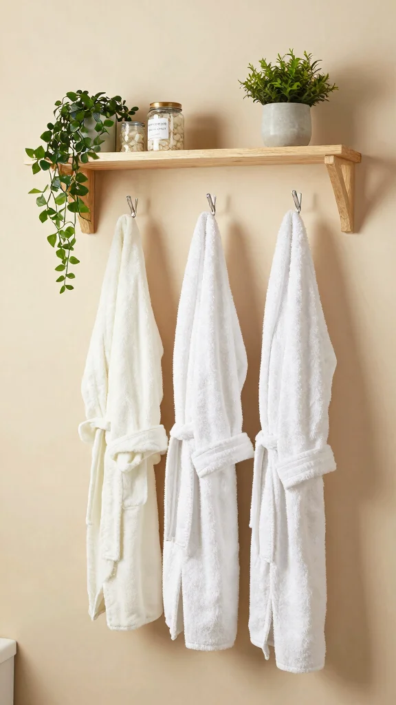 Integrate hooks into your shelving for added functionality! This design allows you to hang items like bathrobes and towels directly from the shelf, keeping them accessible while maintaining an organized look. It’s a practical solution that adds style to your bathroom.
