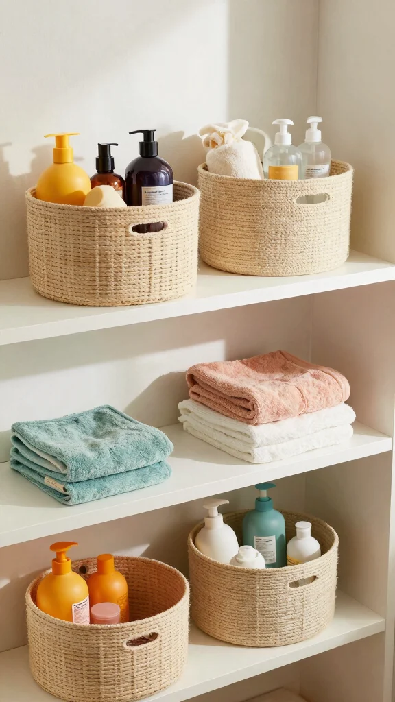 Create a casual and trendy organization method with open baskets on your shelves. They’re perfect for storing smaller items like toiletries or cleaning supplies while adding texture and warmth to your bathroom decor. This approach keeps everything tidy and visually appealing.